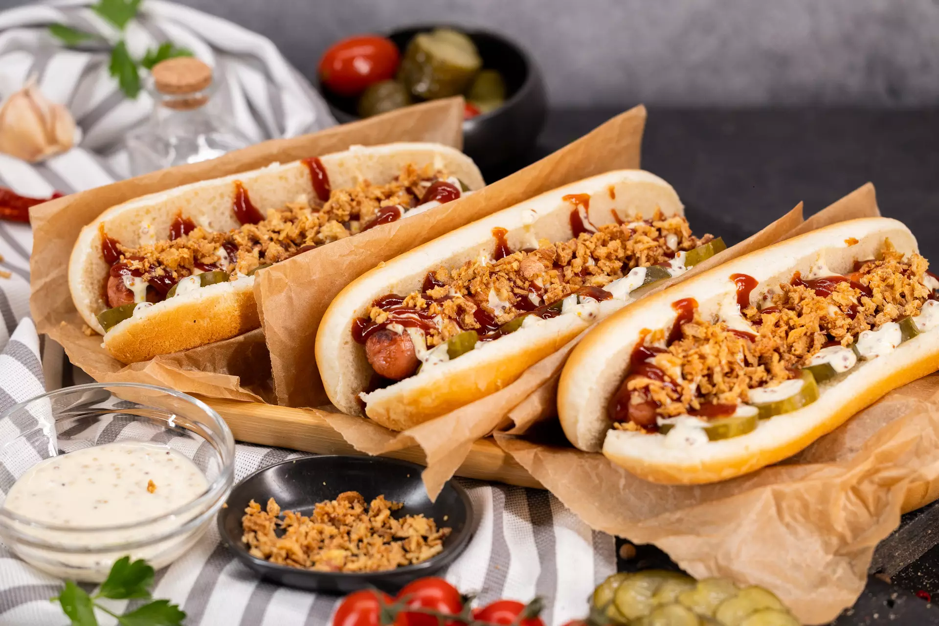 чесночный соус, помидор, зелень